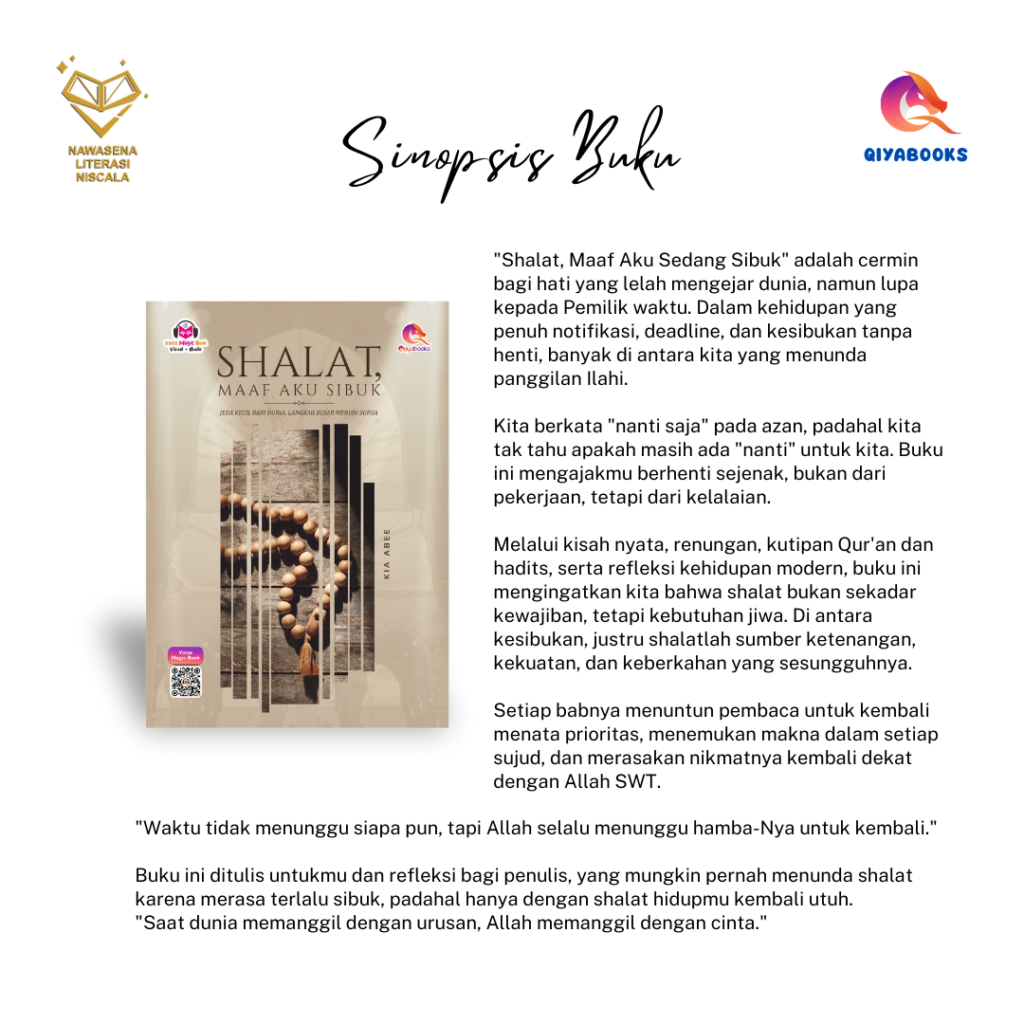 Melalui kisah nyata, renungan, kutipan Qur’an dan hadits, serta refleksi kehidupan modern, buku ini mengingatkan kita bahwa shalat bukan sekadar kewajiban, tetapi kebutuhan jiwa. Di antara kesibukan, justru shalatlah sumber ketenangan, kekuatan, dan keberkahan yang sesungguhnya.